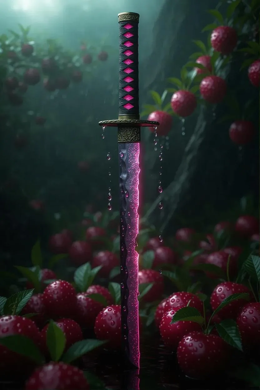 A sleek katana sword forged from dragonfruit skin and seeds, glowing with vibrant pink and green energy, dripping juicy droplets, set against a dark, misty battlefield. Highly detailed, cinematic fantasy weapon, Polyart model, portrait 2:3, ethereal ambiance, dynamic composition.