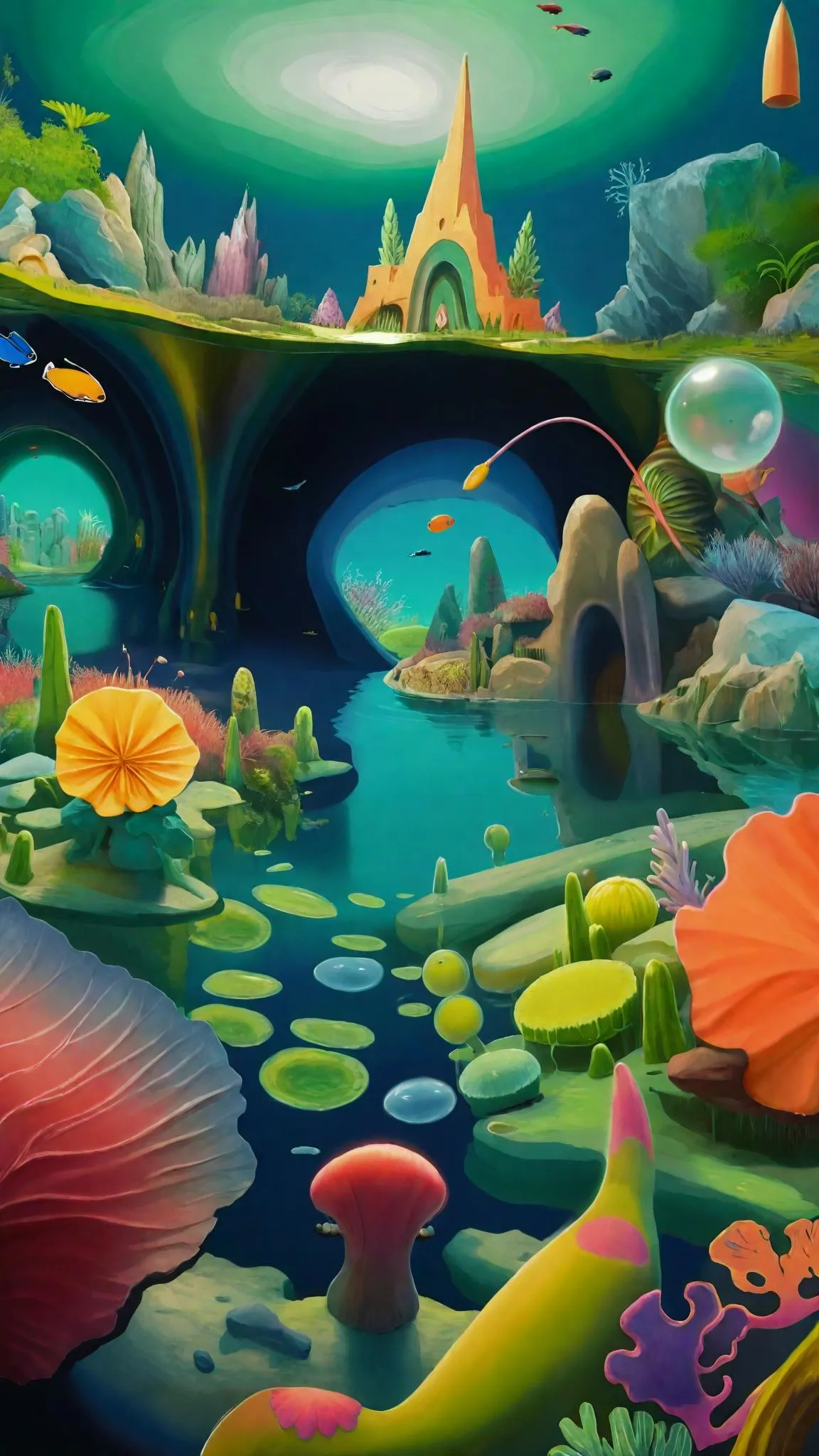 Dive into an AI-generated Cretaceous underwater cityscape with a submerged camera view. Clear blue-green waters reveal psychedelic Eric Carle creatures roaming natural rocks and coral reefs. Explore surreal underworld scenes, lunar landscapes, and meadows with our AI effects for stunning aquatic visuals. Perfect for underwater photography and creative waterpark-themed projects.