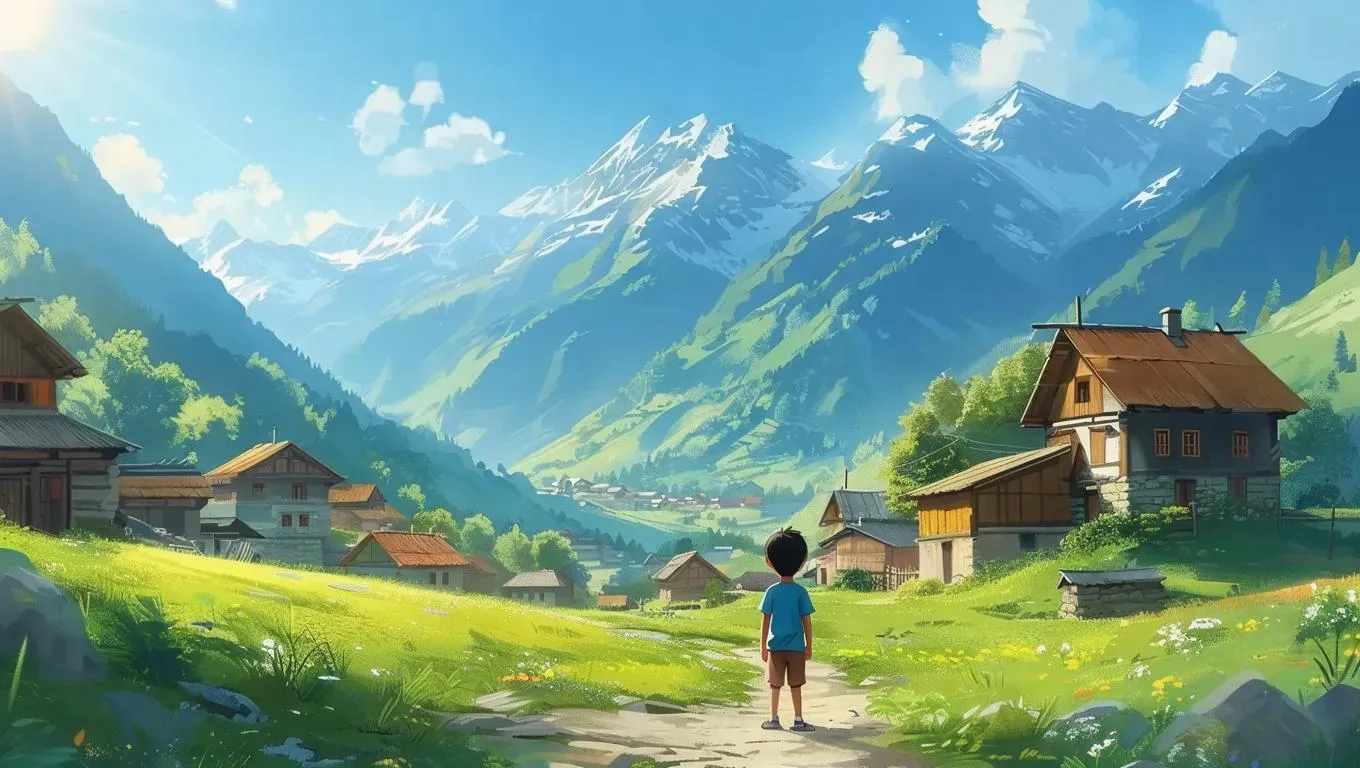 Generate vibrant AI visuals of a joyful boy in a sunlit mountain village surrounded by peaks. Transform text into professional-grade imagery with Vivago.ai, blending serene scenery, vivid landscapes, and creative AI tools for captivating content.