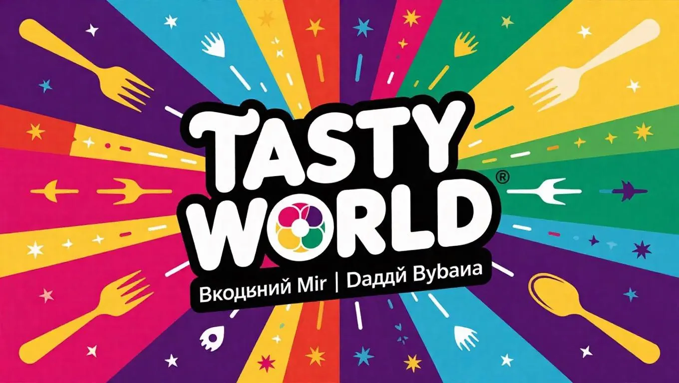 Create an eye-catching Facebook cover for 'Tasty World' food community with bold multilingual typography. Vibrant patterns blend subtle fork/spoon motifs and chef hat elements in fresh, engaging design. Ideal for food-loving groups seeking dynamic, friendly visuals to showcase their multicultural culinary passion.
