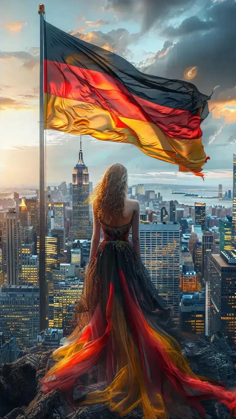 Create stunning AI-generated visuals of a majestic German flag waving over a Ultra-HD cityscape. Featuring a radiant woman in a magical gown, enhanced with cold light effects and 16k resolution. Transform text prompts into professional-grade art with VivaGo.ai's advanced AI tools for lifelike detail and cinematic brilliance.