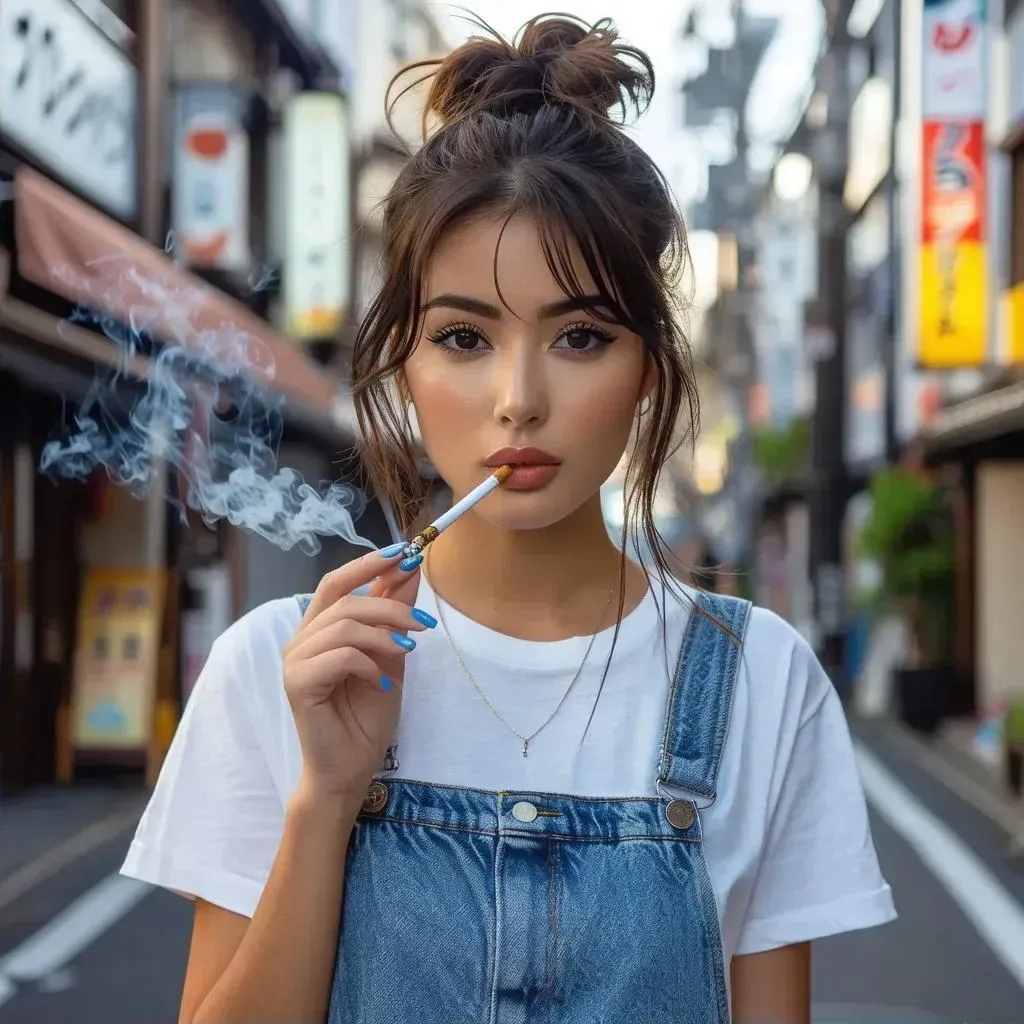 Generate a striking AI image of a Japanese student with bold blue nails, barefoot on an urban street. Featuring edgy double buns, a casual T-shirt, jeans, and smoking a cigarette. Perfect for street-style visuals, digital art, and creative projects. Explore AI-powered effects for professional-grade urban aesthetics and vivid storytelling.