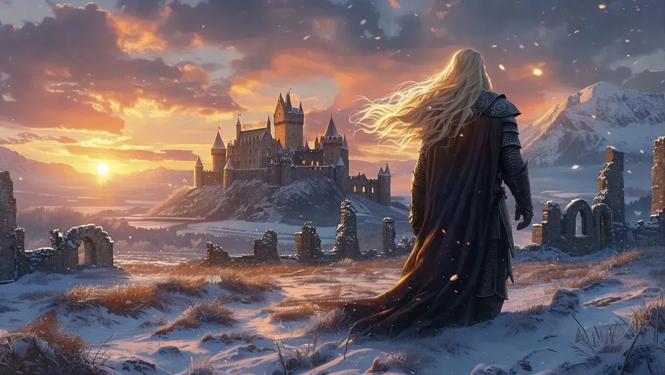 Create enchanting AI-generated fantasy art of a glowing, mystical creature in a winter battlefield scene. Vivago.ai transforms text into vivid visuals, blending magical effects, Lord of Rings-inspired Mount Eribor sunset, ruined fortresses, and ethereal characters for professional-quality, imaginative storytelling imagery.