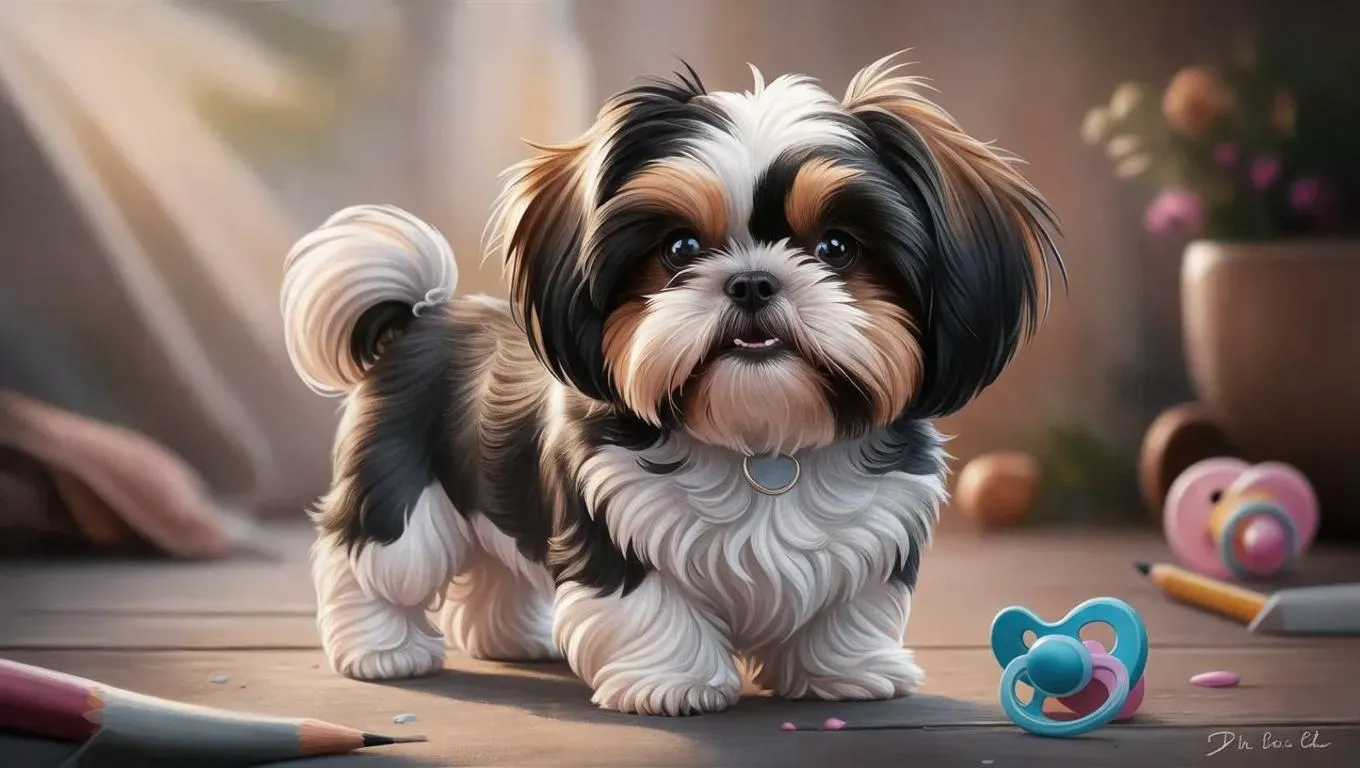 Whimsical colored pencil drawing of a curious black-and-white Shih Tzu with tilted head, expressive eyes fixed mysteriously. Softly blurred background highlights the adorable dog beside an abandoned child's pacifier, blending innocence and intrigue in a storytelling scene. AI transforms text prompts into vivid, emotion-rich visuals with professional detail.