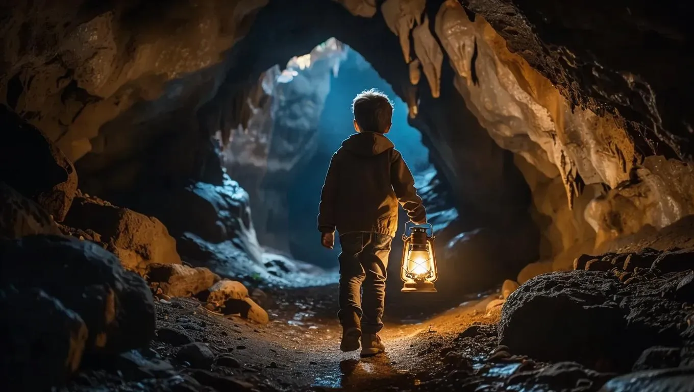 Create mysterious AI-generated images of a boy exploring dark caves with glowing lantern light using vivago.ai. Generate atmospheric scenes with dramatic shadows, realistic textures, and fantasy adventure visuals perfect for storytelling and creative projects.
