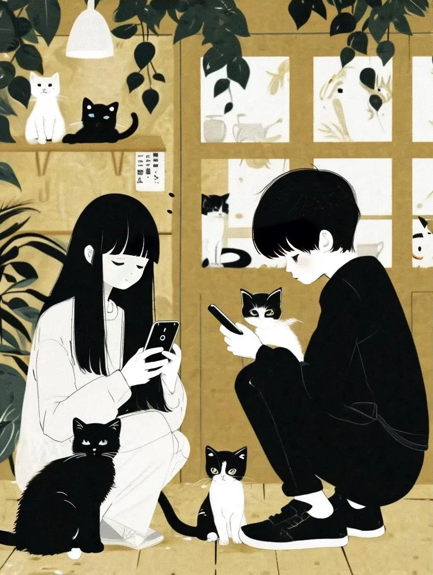 Transform text into vibrant pixel art illustrations with vivago.ai's AI tools. Create charming cat café scenes featuring anime-style characters - a cool black-clad boy photographing a white-dressed girl surrounded by kittens. Generate pixel-perfect AI artwork with detailed anime aesthetics and cozy café atmospheres effortlessly.