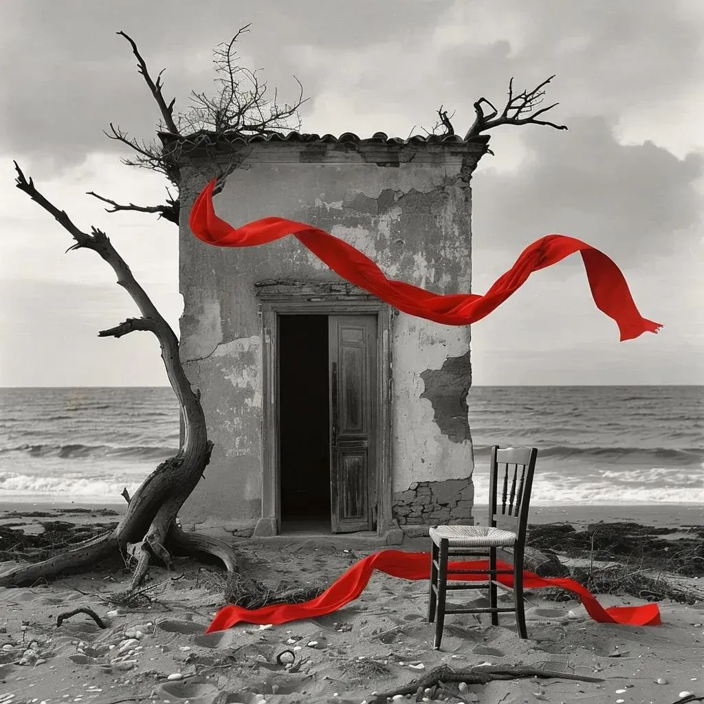 Create a surreal seascape with vivago.ai's AI tools: minimalist grayscale composition featuring weathered facades, barren trees, and symbolic red ribbons. Evocative metaphysical art style blends melancholy mood, high contrast textures, and dreamlike symbolism for striking fine-art photography with desolate, metaphysical atmosphere.