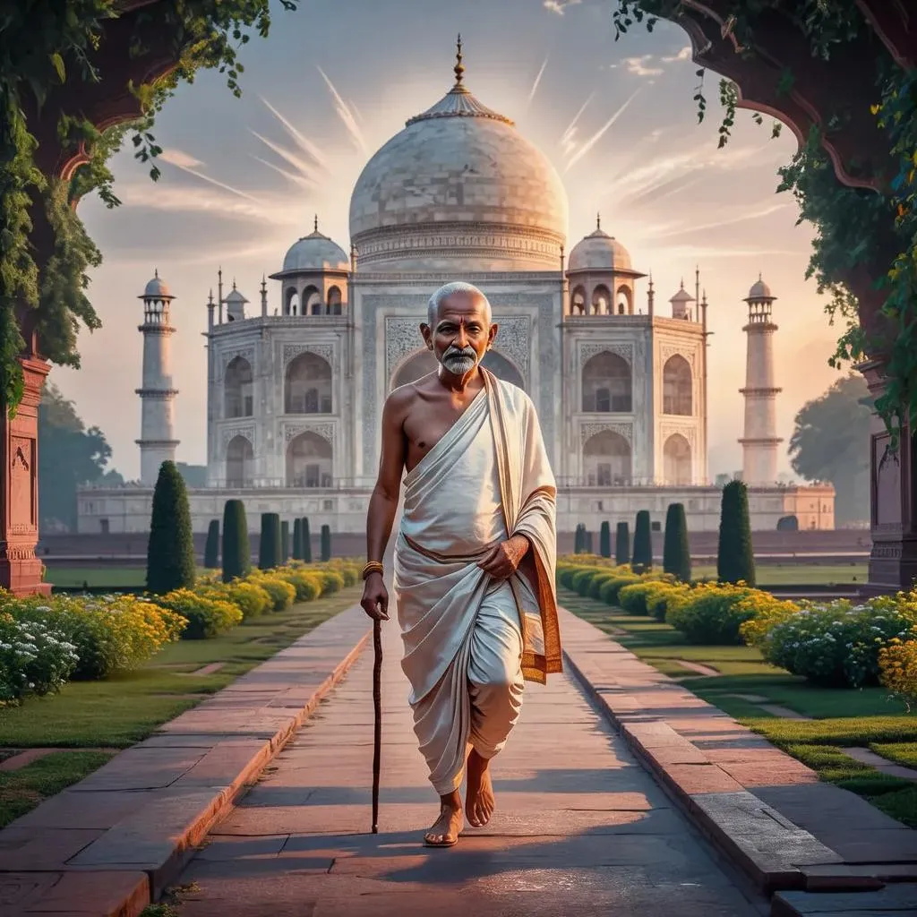 Create a stunning AI-generated image of Mahatma Gandhi near the Taj Mahal with photorealistic detail and cinematic fluorescence effects. Capture his traditional attire, serene posture, and the monument's marble grandeur in soft natural light. Perfect for historical visuals, blending peace, heritage, and lush gardens in a full-body, artistic depiction. Ideal for cultural projects or educational content.