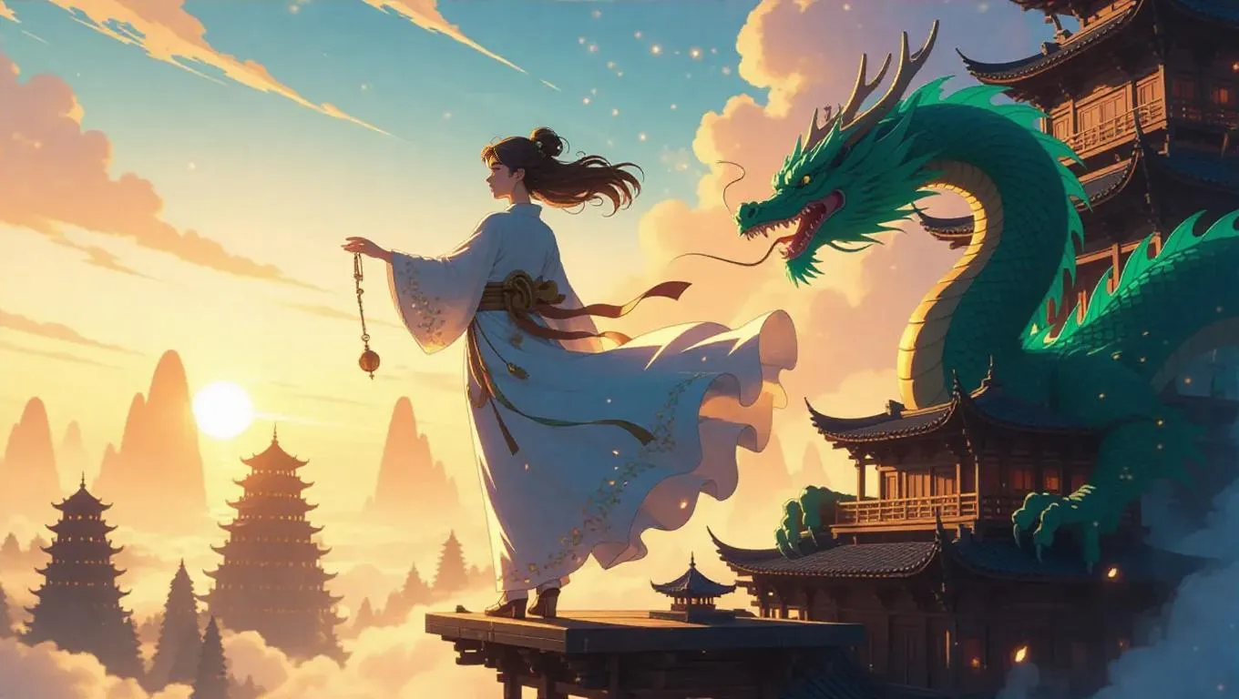 Ethereal Studio Ghibli-inspired AI art captures a hanfu-clad woman floating amid Miyazaki-esque ruins with a cel-animated jade dragon. Watercolor mountains transition from lapis lazuli to peach hues, glowing pagodas dotting slopes as luminous particles orbit bronze pendants. Anime-style twilight skies shimmer with cherry blossom constellations, blending Nausicaä landscapes with Proteus-era lighting and hand-painted cloud dynamics for fantasy digital artistry.