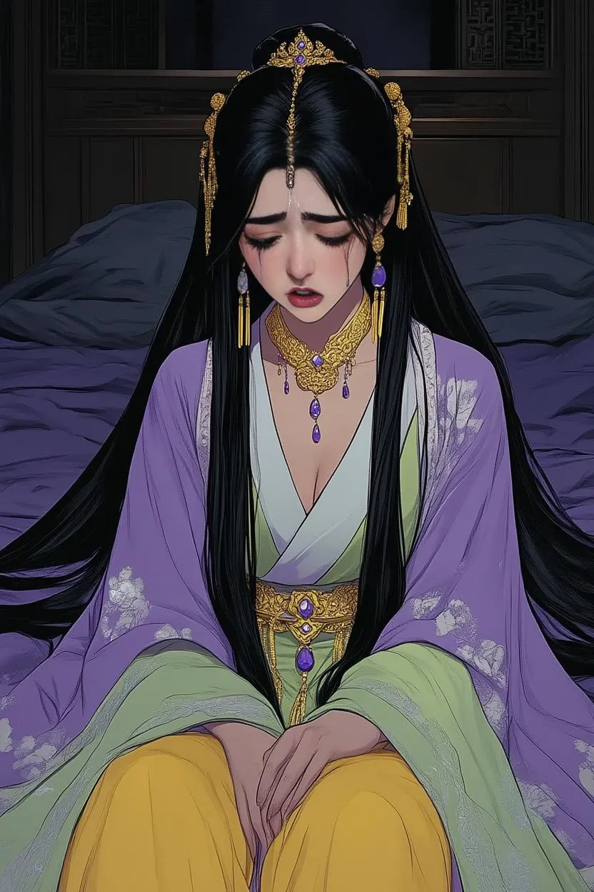 Transform text into vivid AI-generated visuals with vivago.ai. Craft a realistic comic-style dark-haired woman in multicolor hanfu, golden jewelry, and lavender gems, weeping in a gloomy ancient Chinese bedchamber at midnight. Leverage AI tools for lifelike tears, intricate details, and atmospheric lighting to enhance storytelling or artistic projects with professional-grade digital artistry.