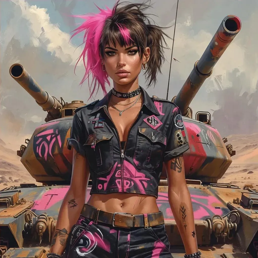 Generate striking AI visuals of a punk-inspired brunette with a pink-streaked "Tank Girl" haircut, clad in tanker coveralls, standing on an Aboriginal art-adorned tank. Ultra HD rendering and texture mapping bring edgy details to life. Explore Vivago.ai's AI tools for bold, high-quality image generation with professional-grade effects.