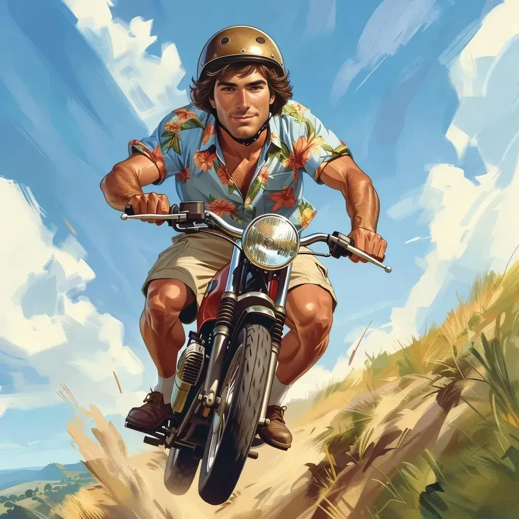 Mr. Bretherton zooms over a hill on his moped in AI-generated comic art style, showcasing mid-aged charm with deep blue eyes, light brown hair, and casual floral attire. Transform text prompts into vibrant visuals using Vivago.ai's AI tools for dynamic character scenes and creative editing.
