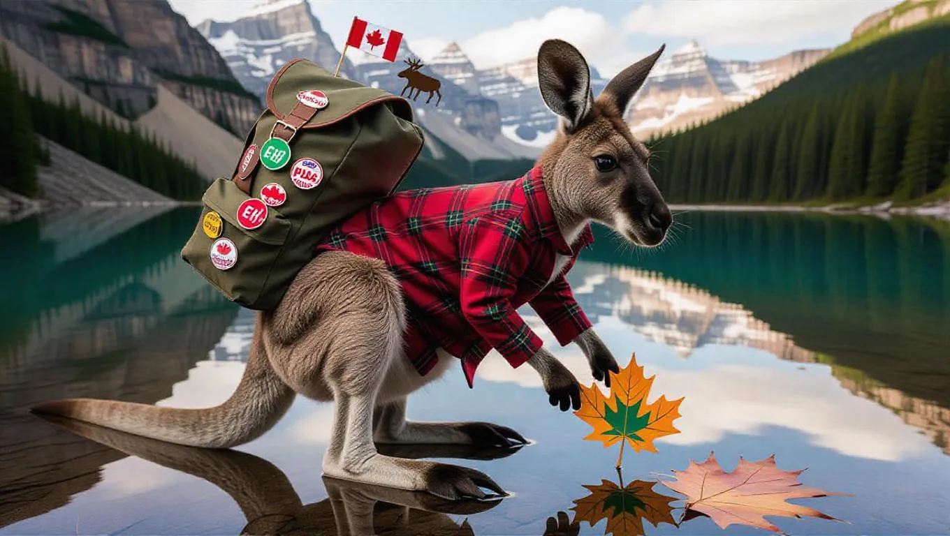 Explore AI-generated Canadian Rockies adventures with a photorealistic kangaroo sporting a red plaid jacket, clutching a maple leaf map. Detailed backpack with enamel pins, trail mix, and miniature canoe model. Snow-capped peaks reflect in crystal-clear lakes under morning light. Crisp 4K fisheye perspective blends realistic fur textures with whimsical eco-tourism charm. Create your wildlife masterpiece at VivaGo.ai.