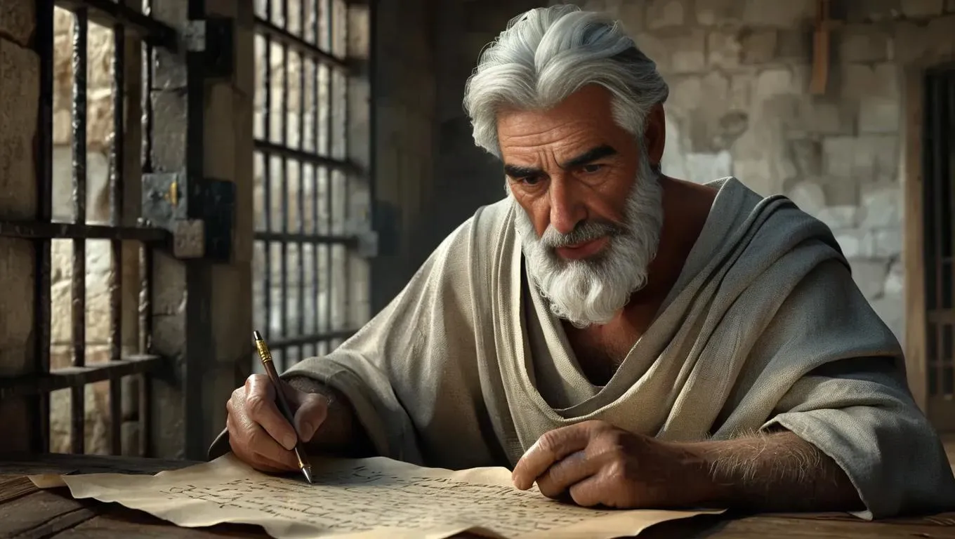 Create a realistic AI-generated image of a 50-year-old man in a Roman prison, with white hair, a beard, and a weathered gray tunic, meticulously writing on parchment. Ideal for historical storytelling, educational visuals, or artistic projects requiring authentic ancient Roman scenes and emotional character depth.