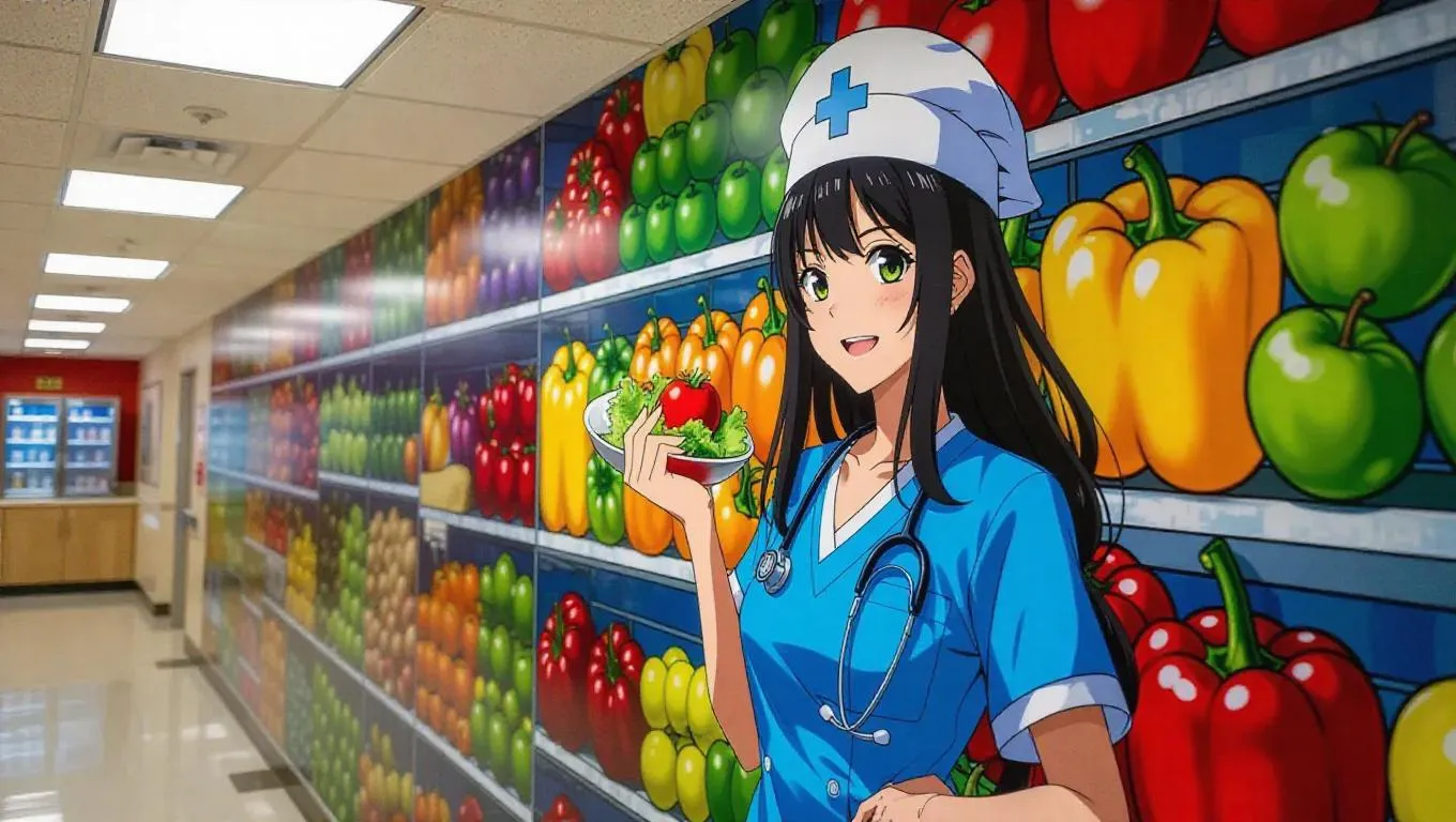 Transform hospital cafeterias with AI-generated murals featuring a vibrant anime nurse illustrating basic food groups. This creative healthcare artwork combines nutrition education with playful anime aesthetics, enhancing cafeteria environments through unique AI-powered visual storytelling. Perfect for uplifting medical spaces.