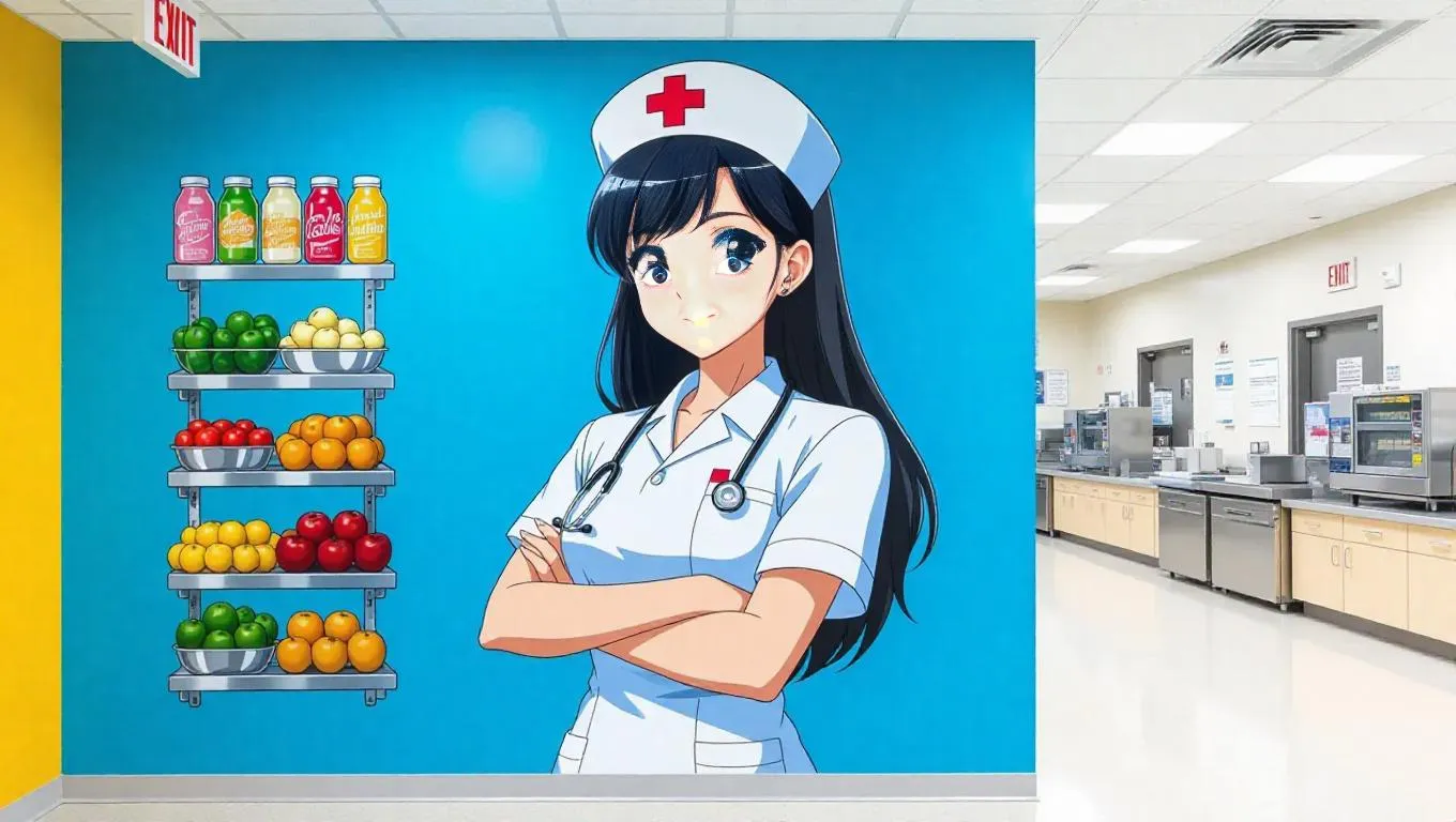 Transform hospital cafeterias with AI-generated murals featuring a vibrant anime nurse illustrating basic food groups. This creative healthcare artwork combines nutrition education with playful anime aesthetics, enhancing cafeteria environments through unique AI-powered visual storytelling. Perfect for uplifting medical spaces.