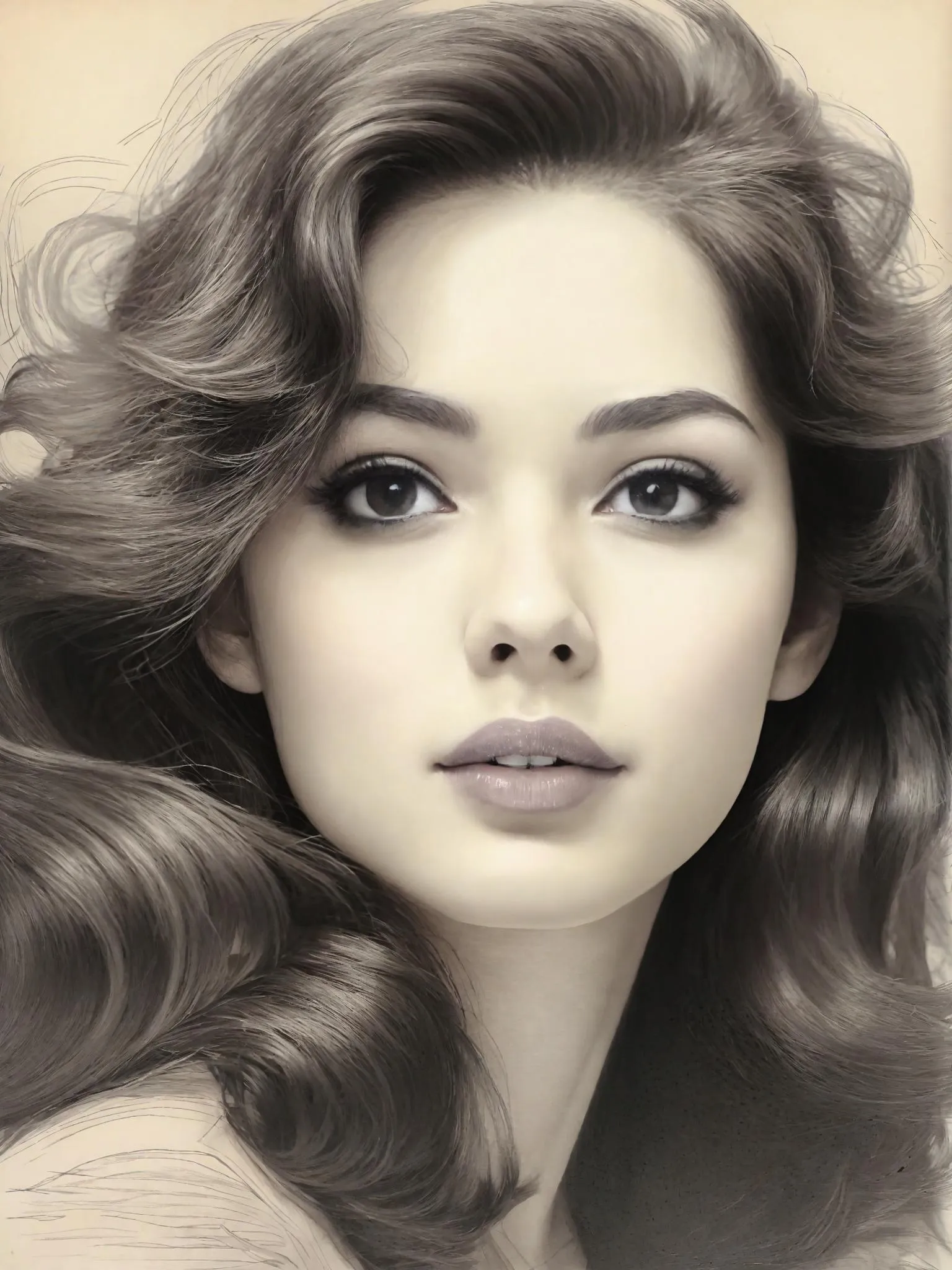 4K铅笔画,1970s摩登女郎,大波浪卷发垂肩,眼睑描摹细致睫毛膏质感,经典哑光唇妆,面部光影立体如银幕明星,素描纸纹理清晰可见,东方年轻女性。