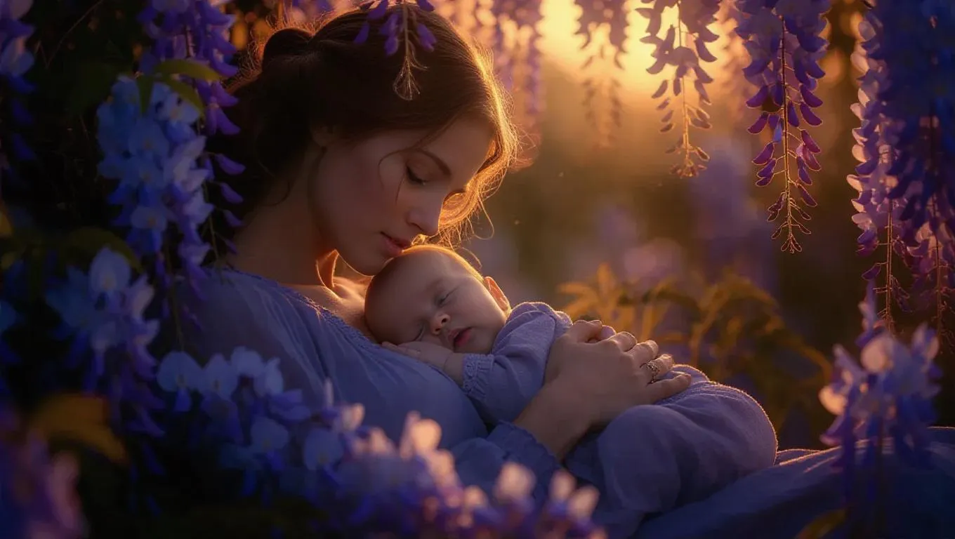 Vivid AI-generated mother-child portrait amidst ethereal garden scenery: glowing wisteria cascades, floating cherry petals, and firefly accents bathed in golden sunset warmth. Experience chromatic glow blending weathered textures with newborn softness through advanced amber-coral tonemapping. Vivago.ai crafts this luminous moment using chromatic aberration effects, natural bokeh, and AI-enhanced floral details for emotionally resonant visual storytelling.