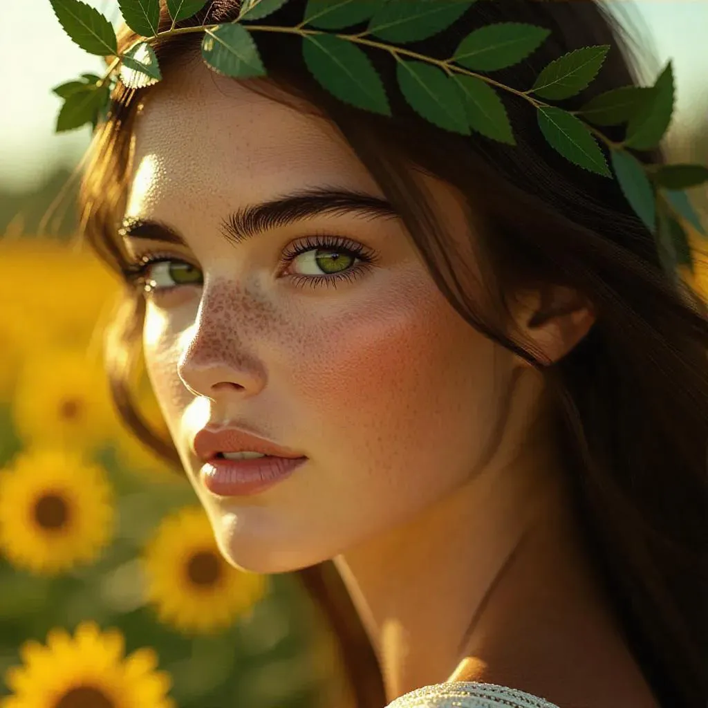 Generate ultra-realistic 4K AI portraits of Greek goddesses with serene expressions, flawless skin, and laurel tiaras. Seamlessly blended with Van Gogh-inspired sunflower fields in swirling golden brushstrokes. Combines classical elegance and vibrant impressionist textures for captivating, harmonious AI artistry.