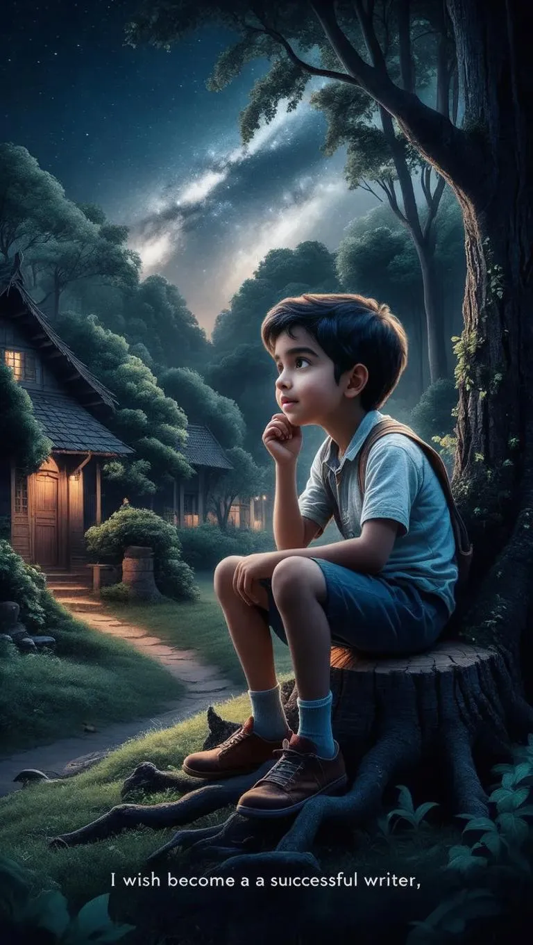 Transform Rahul's inspiring village story into a vibrant cartoon scene with sky-blue hues and digital universe elements. Generate medium-shot visuals of his heartfelt wish under the tree, featuring detailed medium hair. Perfect for AI-powered storytelling, creative writing projects, and professional-grade cartoon effects in image/video generation.