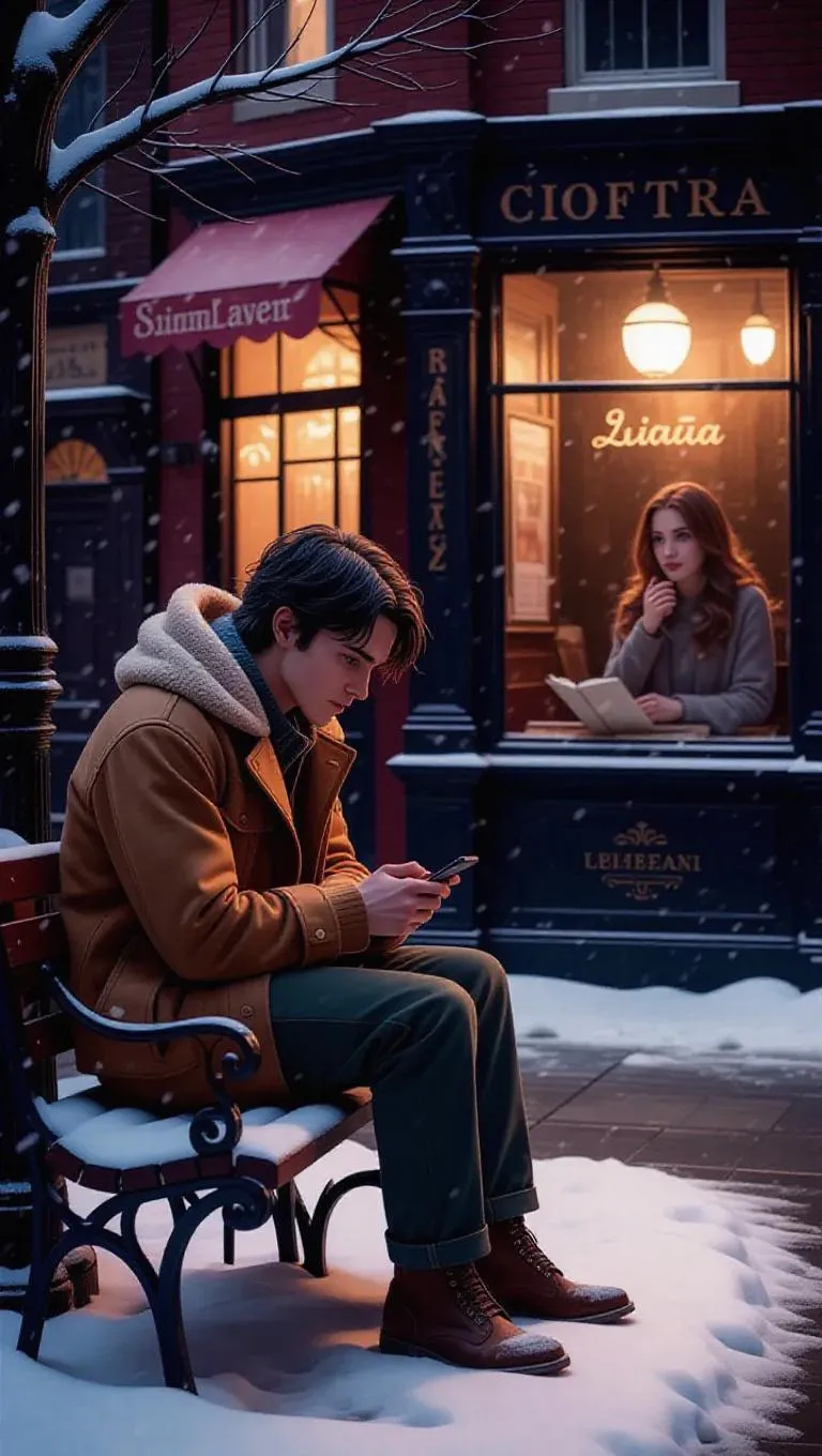 Anime-style winter cityscape at night, snow falls gently, Elias sitting alone on a park bench, hunched slightly, phone in hand, tall, lean build, tousled dark brown hair, hazel eyes, olive skin, layered earth-toned casual clothes, vintage film camera. Across the street, Liora inside a softly lit café, watches him from behind the glass, hands cupped around a warm mug, medium height, long wavy auburn hair, fair skin with freckles, green eyes, flowing or cozy layered clothes, sketchbook. Bittersweet expression, world feels quiet and still.
