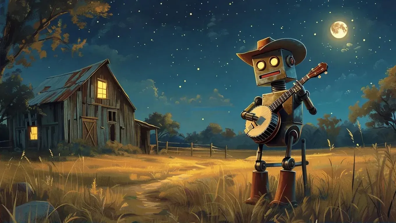 Immerse in a nostalgic AI-generated scene where technology meets tradition: a moonlit countryside with a robot strumming a heartfelt banjo melody. Rustic charm blends with futuristic elements—soft warm light, swaying grass, and twinkling stars. Perfect for AI art lovers seeking unique, emotive visuals merging AI innovation and timeless rural vibes. Create now on vivago.ai.