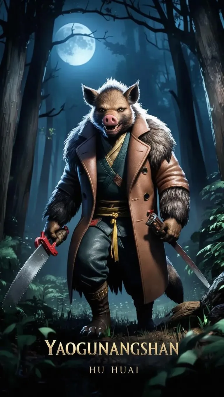 Explore AI-generated mythical creature art with Yaoguangshan's "Crafty Hu Huai." This pig-hyena hybrid, cloaked in coarse fur, emerges from forest hibernation, emitting eerie saw-like cries foretelling doom. Rendered in AI-powered ominous woods under moonlight, eerie shadows amplify its haunting presence. Perfect for dark fantasy visuals and supernatural storytelling with vivago.ai's advanced image-generation tools.