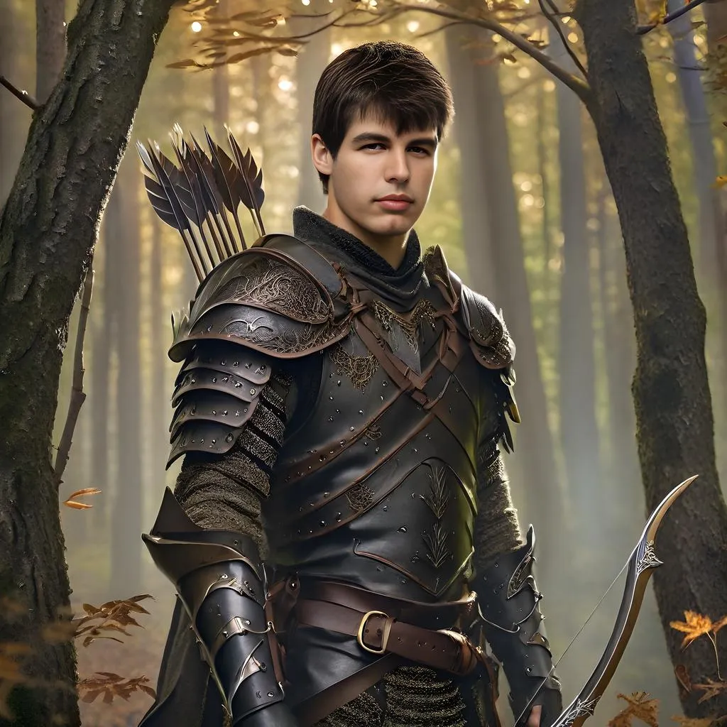 Create AI-generated visuals of a fantasy warrior in leather armor wielding a longbow in a dark forest. Craft a thin, handsome young man with vivid details using text-to-image AI tools and professional editing effects for immersive, imaginative artwork.