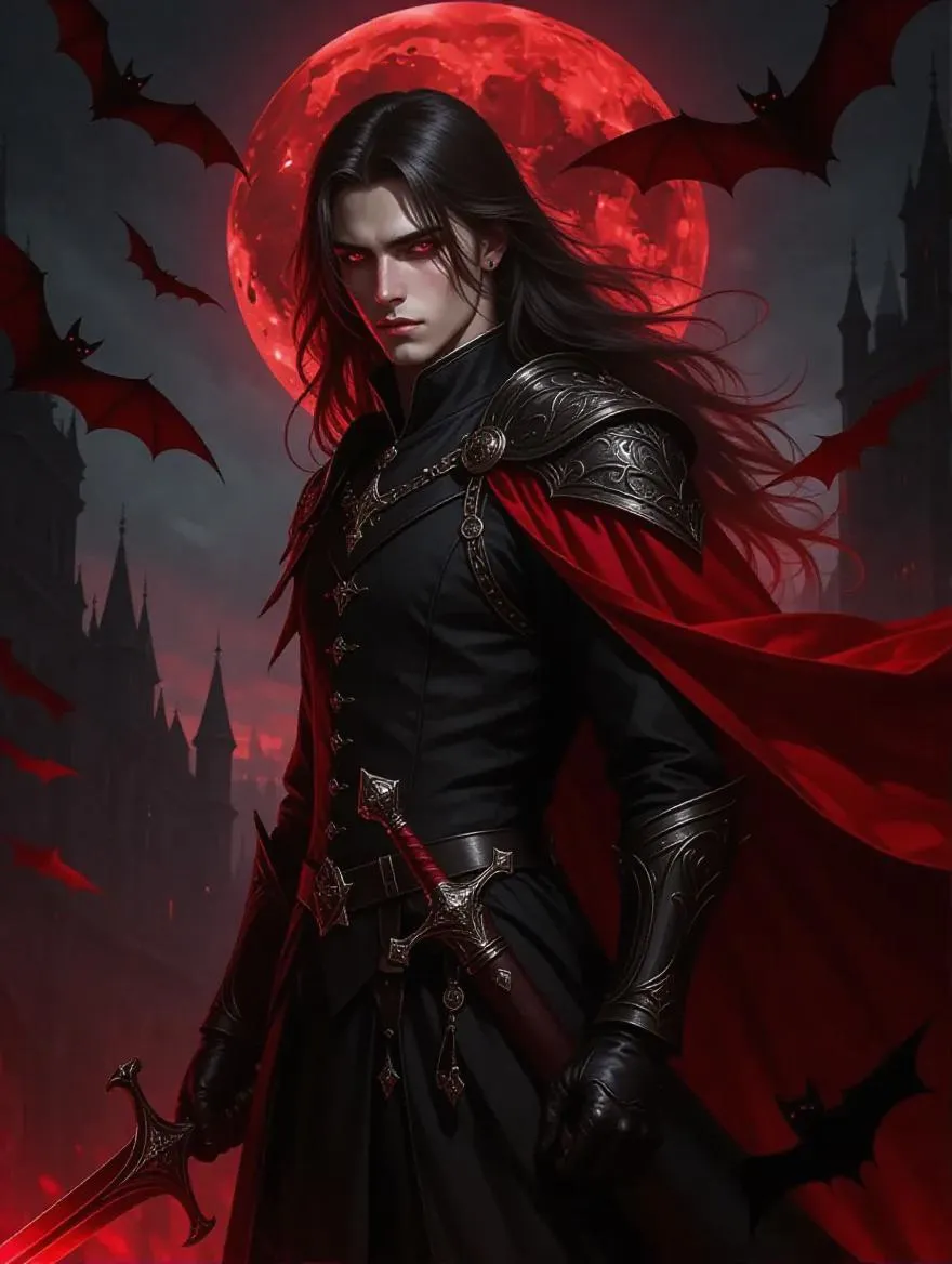Loose waves, black hair, red eyes, fair skin, long hair, handsome guy with a beautiful face, jet black aristocrat costume, crimson cloak dripping with blood, red full moon, bats swirling overhead, devil's castle in the background, red sword dripping with blood in his hand, approaching menacingly.