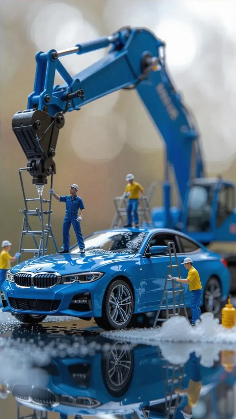 Generate a hyper-realistic 8K scene of microscopic car washers cleaning a colossal blue vehicle with thimble-sized hoses and bottle-cap buckets. Features ultra-detailed textures, cinematic depth of field, and hyper-realistic reflections. Perfect AI-generated imagery showcasing professional-grade editing tools for surreal scale contrasts and photorealistic visual storytelling. Elevate creative projects with Vivago.ai's advanced AI effects.