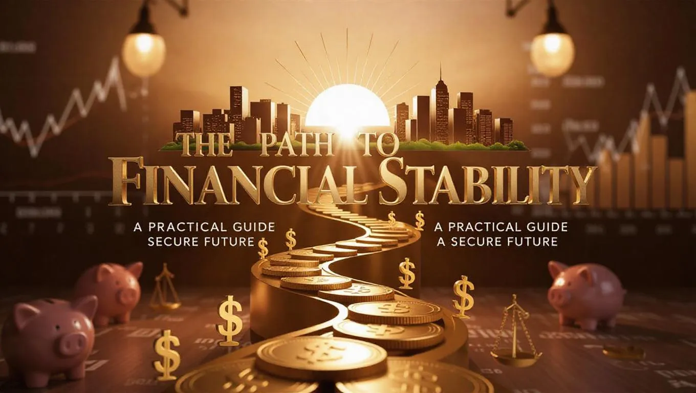 Discover "The Path to Financial Stability" by Given Jele—a practical guide to building wealth. Golden coins, sunrise over modern cityscapes, and symbols like piggy banks and balanced scales illustrate this roadmap to financial security. Ideal for seekers of prosperity with bold metallic text and warm amber tones blending ambition and stability in professional design.