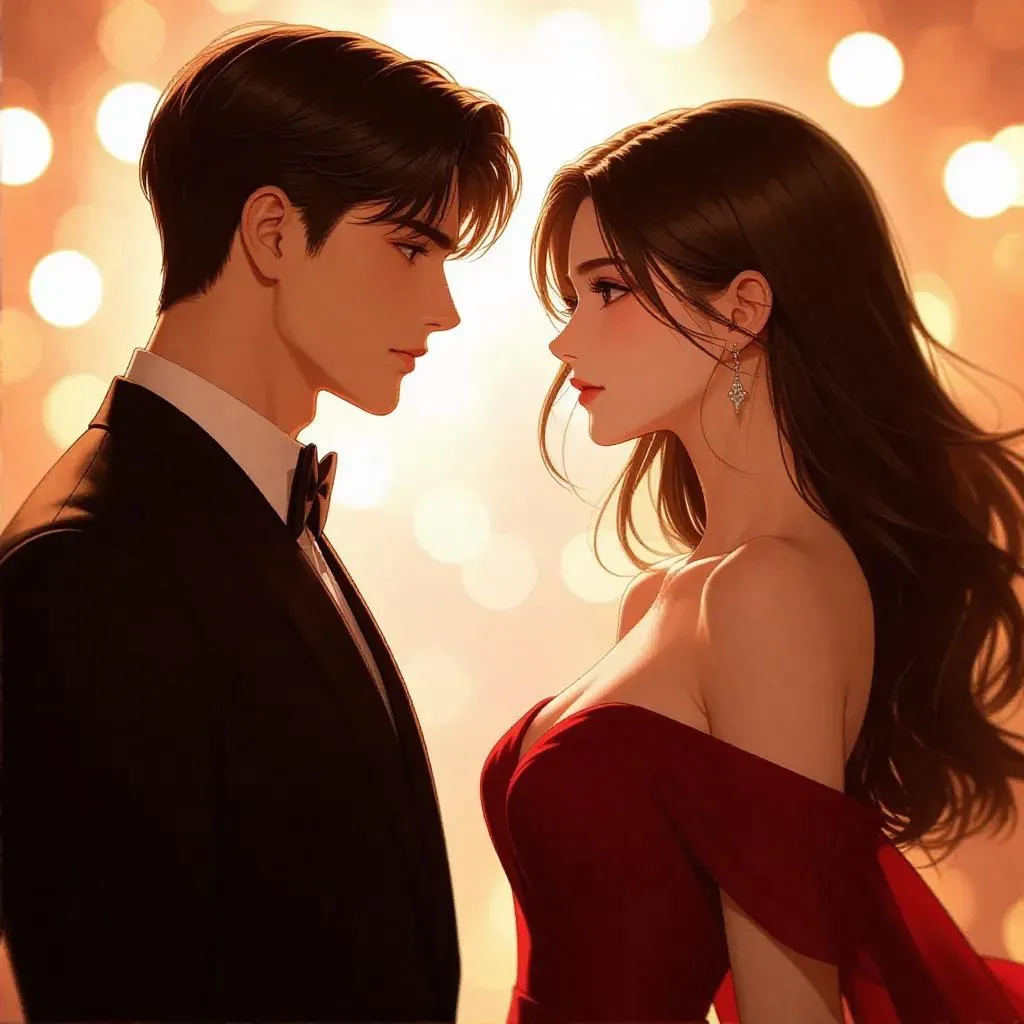 A beautiful woman and man gazing at each other from a distance, woman in a flowing dark red dress, man in a sharp black suit, set in an atmospheric anime photo with soft lighting, romantic tension, and a blurred background enhancing their connection.