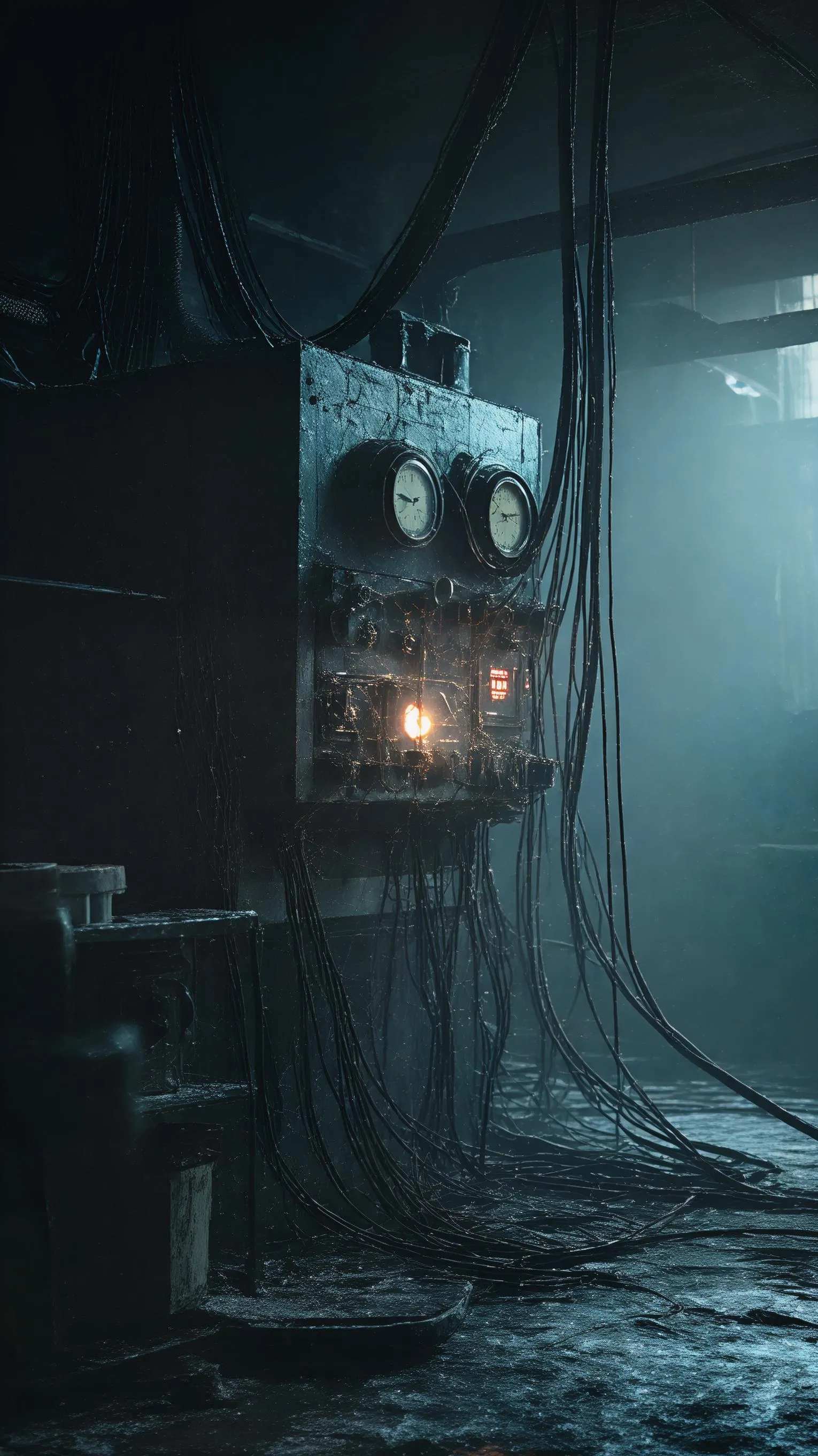 Generate eerie AI images of an abandoned lab with a dormant yet alive machine pulsing internally. Capture cinematic horror realism: deep shadows, oppressive silence, high contrast lighting, soft film grain. Create this dark, atmospheric scene using Vivago.ai's powerful text-to-image generator for professional visuals. Perfect for horror & sci-fi concepts.