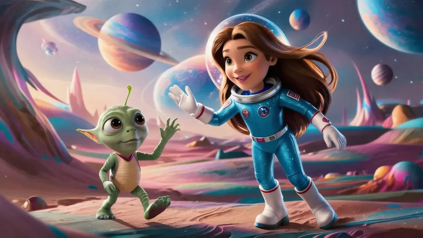 Create a whimsical Pixar-style animation of Princess Noura with flowing brown hair and a sparkling blue spacesuit exploring a vibrant alien planet. Meet a clumsy green alien tripping over its feet in this humorous, surreal scene. Crafted with AI image generation tools for professional-grade creative storytelling. Transform ideas into vivid visuals effortlessly!