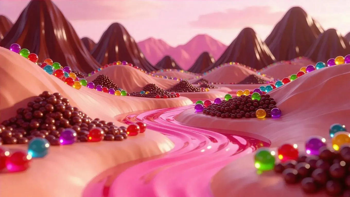 Indulge in a whimsical dessert wonderland crafted from creamy milk chocolate hills, crunchy dark chocolate rocks, and a glistening strawberry syrup river with floating gummy candies. Warm, soft lighting highlights mouthwatering textures, creating a magical AI-generated landscape where sweets transform into enchanting terrain. Explore this edible paradise with VivaGO.ai's creative AI tools.