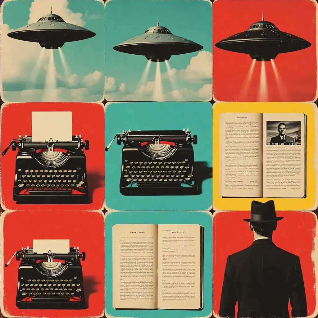 Generate a retro-styled 1950s CIA mystery collage with AI. Featuring UFO conspiracies, Men in Black, and top-secret files in vintage hues. Perfect for conspiracy-themed visuals blending Cold War intrigue with atomic-age aesthetics. Create captivating retro-futuristic scenes using AI image generation tools.