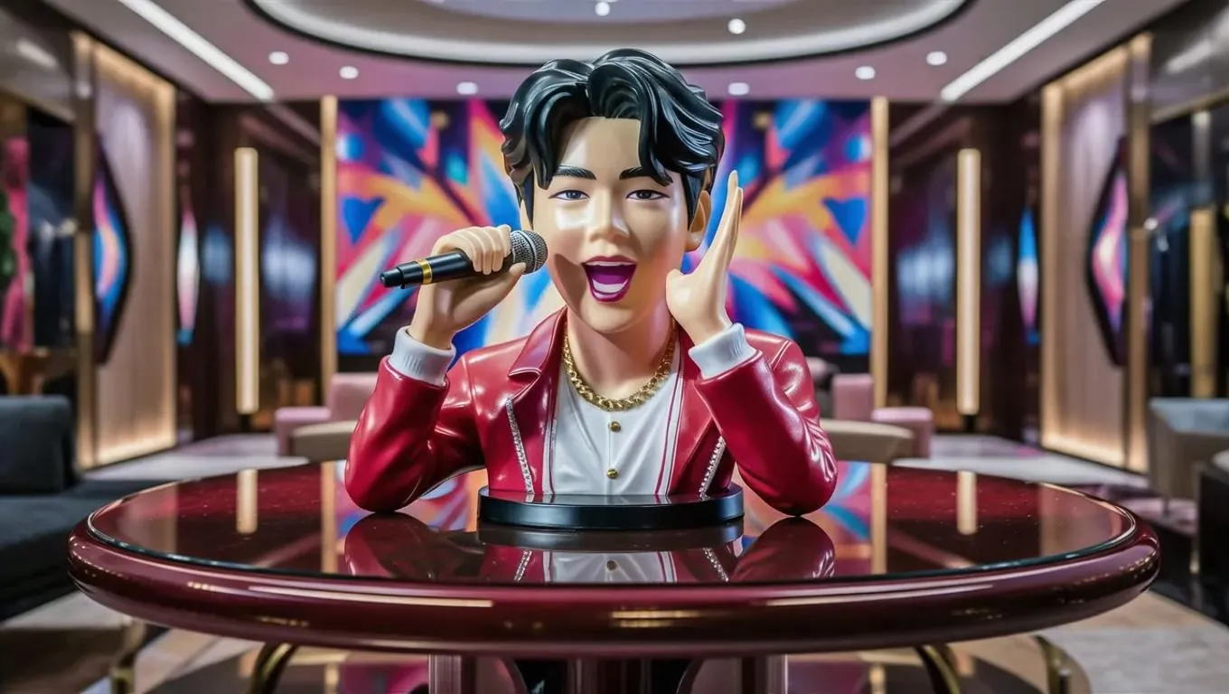 Create a vibrant AI-generated image of a Felix (Stray Kids) Kpop plastair statue singing, displayed on a tabletop for sale. Perfect for fans seeking unique Kpop merchandise. Explore AI tools for detailed, lifelike collectible visuals with vivago.ai's creative solutions.