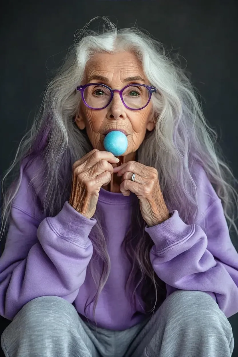 Generate ultra-realistic AI images of an 80-year-old woman with long white-purple hair, brown eyes, and a thin frame wearing bold blue glasses, purple sweatshirt, gray gym pants, and basketball shoes. Perfect for AI art projects, this prompt combines quirky details (chewing gum, Viola shoes) with vivid realism using advanced AI image generation tools.