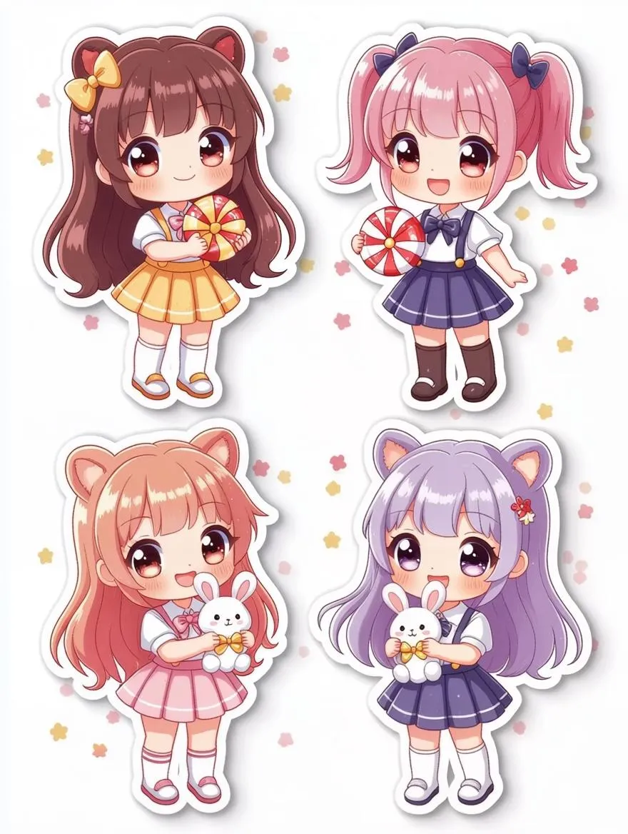Generate adorable chibi girl sticker art featuring four candy cuties with bunny toys, distinct hairstyles, short skirts & long socks. Colorful minimalist designs, simple kawaii cartoon style with clean lines, flat color, and gentle shading. AI-generated full-body characters on a white background. Try our AI effect for cute sticker sets at VivaGo.ai.