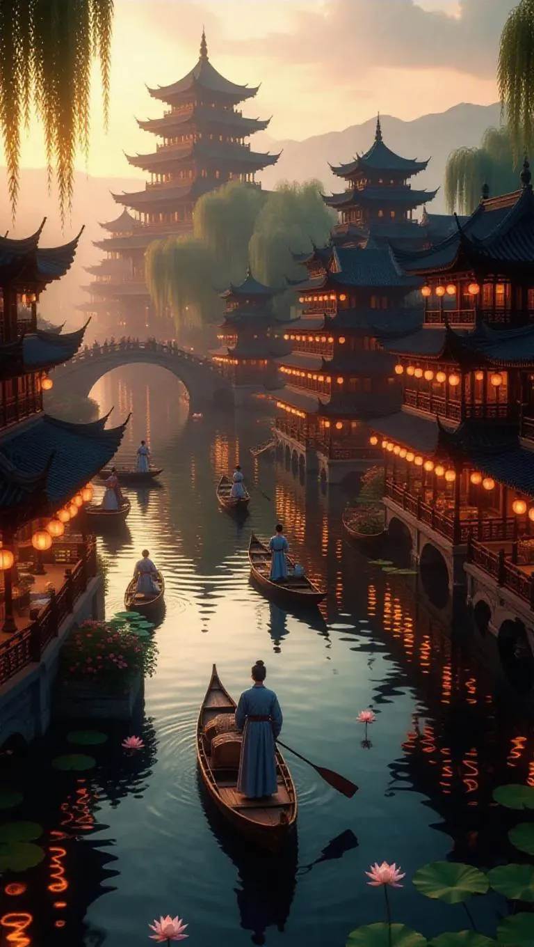 A grand riverside city in ancient China, bustling with silk-robed nobles, market stalls of pearls and jade, ten thousand layered rooftops beneath misty willow trees. Painted arch bridges span sparkling canals, fishermen and lotus girls laugh in boats under lantern-lit curtains. Golden osmanthus trees bloom by twin lakes, miles of lotus flowers sway. A poet, tipsy and smiling, stands on a pavilion, watching dancers and flutes under sunset clouds. Anime-style brilliance, flowing silk, shimmering water, dreamlike city lights.