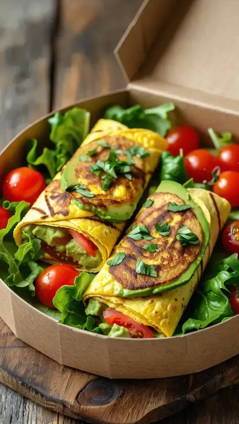 Savor artfully arranged sliced omelet wraps filled with creamy avocado puree and white cheese, paired with fresh cherry tomatoes and crisp lettuce. Presented in an eco-friendly kraft cardboard box on a rustic wooden surface, this nutritious meal combines gourmet flavors with visual appeal—perfect for food photography and healthy brunch inspiration.