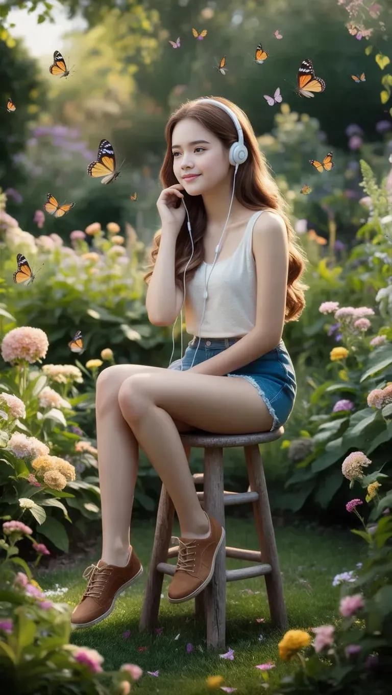 Experience serene garden tranquility with vivago.ai's AI-generated "Nature Escape." A young lady relaxes on a rustic stool amidst blooming flowers and fluttering butterflies, earbuds in for peaceful solitude. Transform text into vibrant, nature-inspired visuals effortlessly using professional AI tools for stunning, immersive outdoor scenes.
