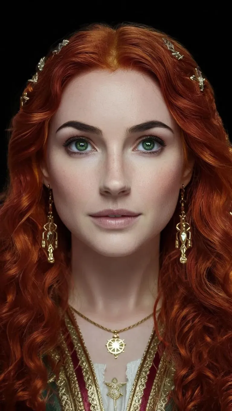 Generate an AI-powered close-up portrait of a striking biblical-era woman with vibrant red hair and piercing green eyes. This high-resolution image combines historical authenticity with artistic flair, set against a dramatic black background. Perfect for historical visuals, religious storytelling, or character design projects requiring ancient-inspired beauty and vivid AI-generated details.