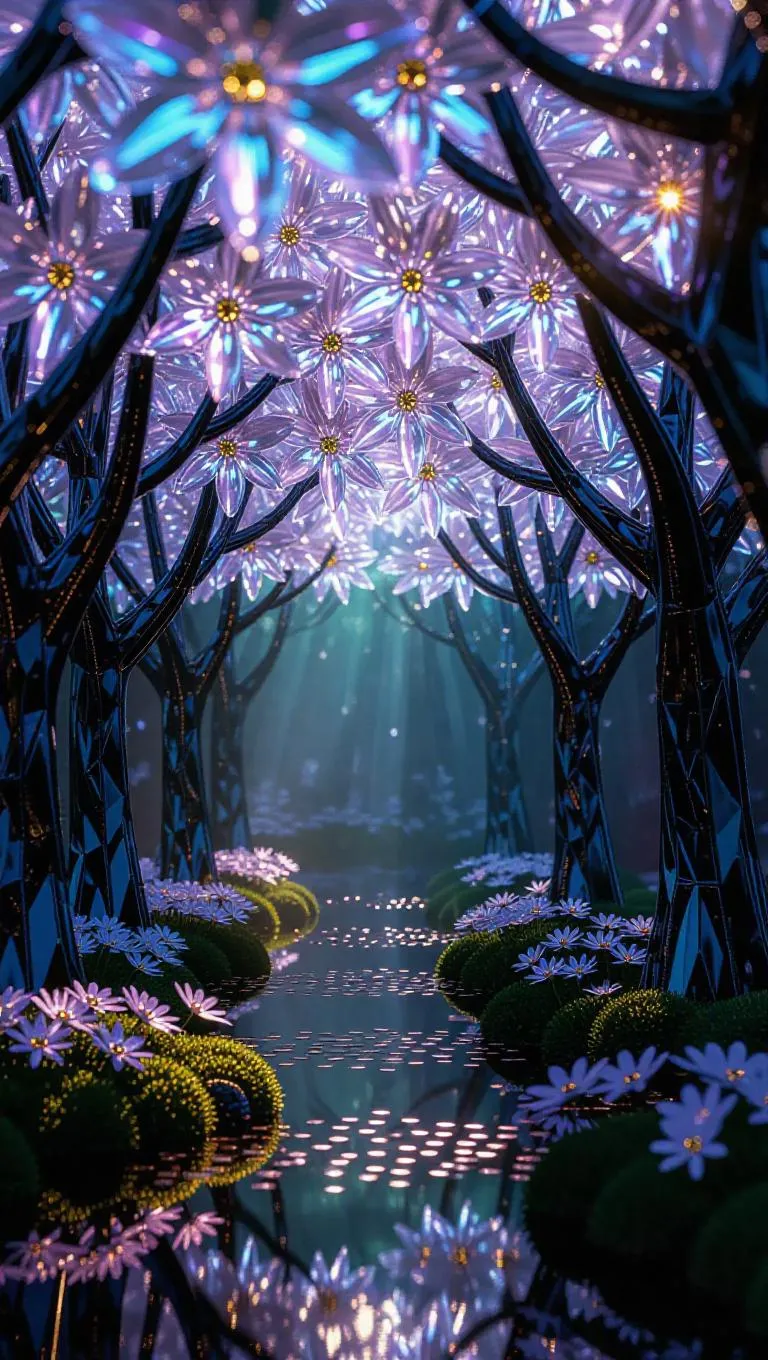 Create mesmerizing AI-generated visuals of an enchanted crystal forest with mirror trees, iridescent flowers, and light-reflecting landscapes. Perfect for fantasy art projects, Vivago.ai transforms prompts into professional-grade digital magic using advanced AI image generation tools. Ideal for surreal scenes, luminous effects, and slow-motion nature transformations.
