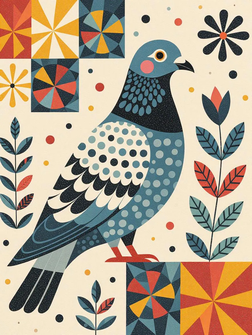 AI-generated geometric pigeon art with ink textures and mixed media patterns. Symmetrical bird illustration blending organic brush-strokes, splashes & geometric shapes. Modern abstract animal design featuring balanced patchwork composition and harmonious aesthetic. Create this unique AI art effect at vivago.ai.
