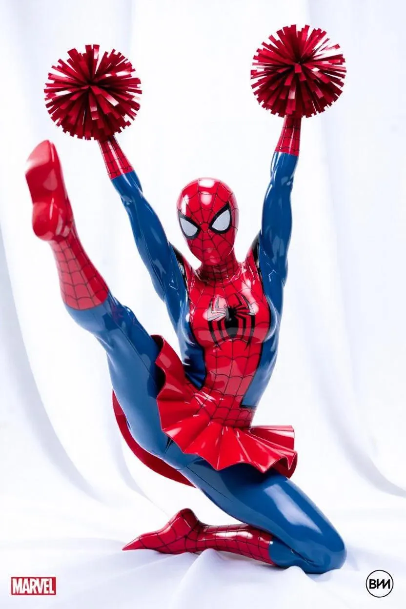 A high-resolution character render of Spider-Man standing on a crisp white backdrop, he is mid-kick, one leg sky-high, arms raised with pom-poms bursting in each hand. He wears a glossy red latex mini skirt with black webbing patterns and a mischievous spider emblem stretched across the back. His top is a tight crop with a red-and-blue superhero theme, matching his classic suit colors. Spider-Man’s body is lean and acrobatic, mid-flip, landing in a perfect split with arms raised and fingers splayed in victory. His mask stays on, but a playful energy radiates from his pose. The outfit glistens under imaginary studio lights, the latex hugging his physique with a bold, campy confidence.