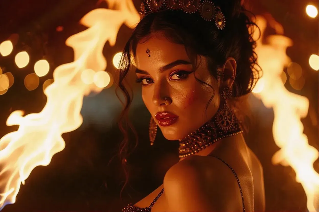 Vibrant AI-generated image of a beautiful Mexican woman in a fiery circus performance, blending steampunk elements like gears and brass accents. Dramatic high-contrast photography highlights her strength, elegance, and passion during a fire show. Perfect for artistic storytelling, creative visuals, and immersive AI-powered steampunk-inspired content.