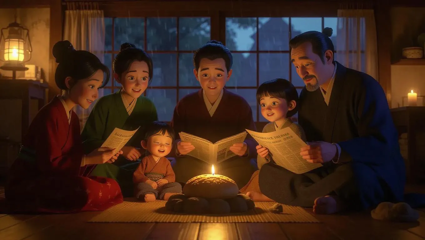 Anime family gathered in a cozy hut, the mother kneading bread by the fireplace, the father reading the newspaper near a flickering candle, the grandmother knitting wool with nimble fingers, three children sleeping soundly on a futon, rain tapping on the windows, which open and close gently from the cold breeze.
