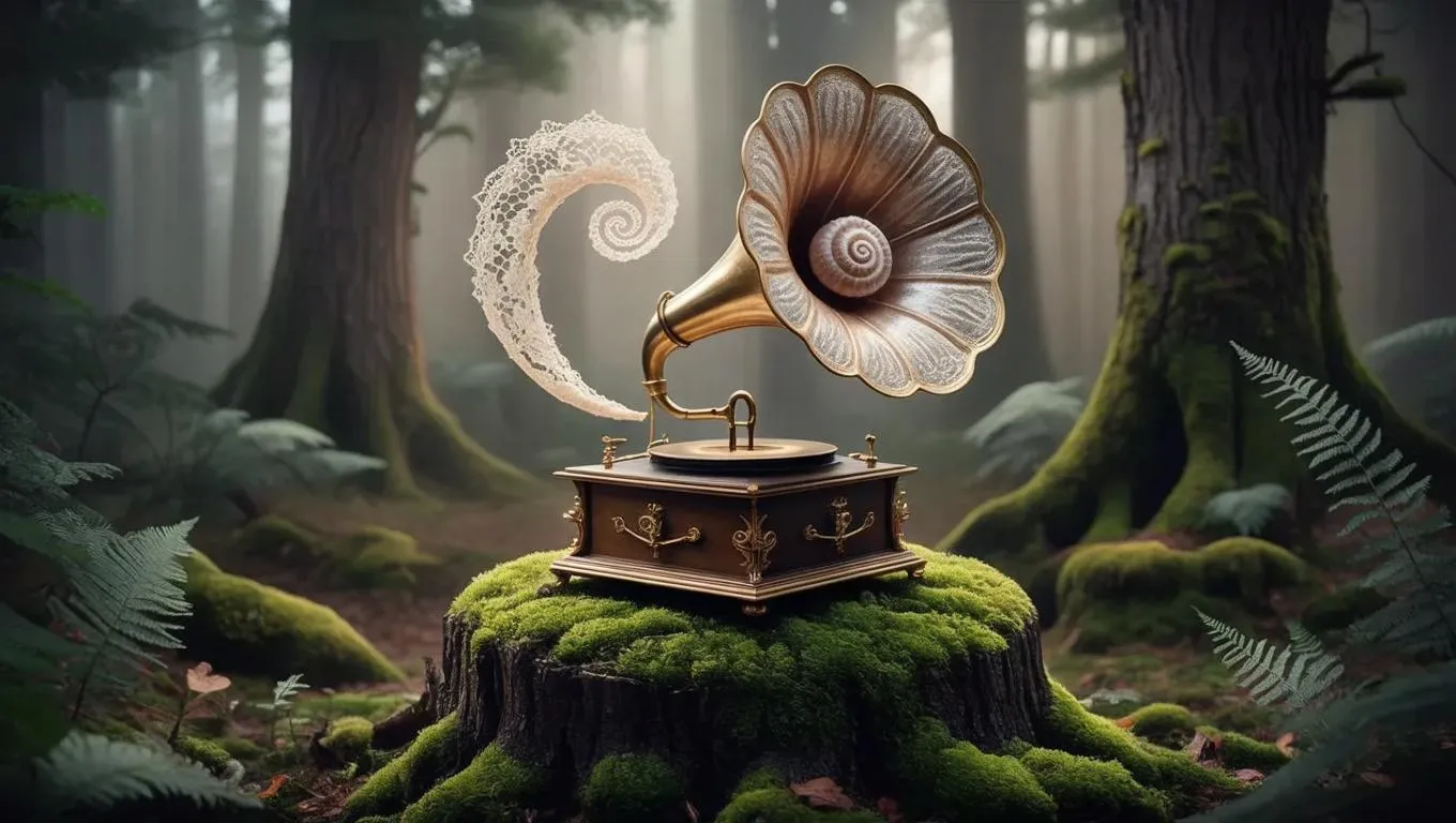 Capture "Dreamlike Convergence" with AI image generation, blending Remedios Varo's surreal artistry. An ornate gramophone on a moss-covered ancient tree stump emits lace-like sound waves from a nautilus-shaped horn in a misty forest. Low-angle shot and shallow depth of field highlight mystical visuals, merging AI effects with surreal dominance for professional-grade, ethereal artistry.