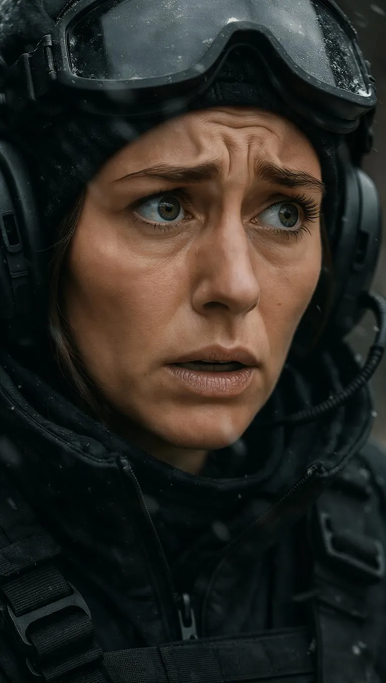 Close-up of the woman’s face, tactical rugged dressed wide eyes, breath visible in cold air. Straining to listen, expression caught between fear and disbelief. Dramatic realism, shallow depth of field.